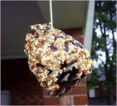 Una piña pequeña de Pinus sylvestris, un vestido de masa de harina y agua y una cuerda para colgar son suficiente para la fabricación del adorno residuo cero. Podéis ver la ficha didáctica de comederos de pájaros.