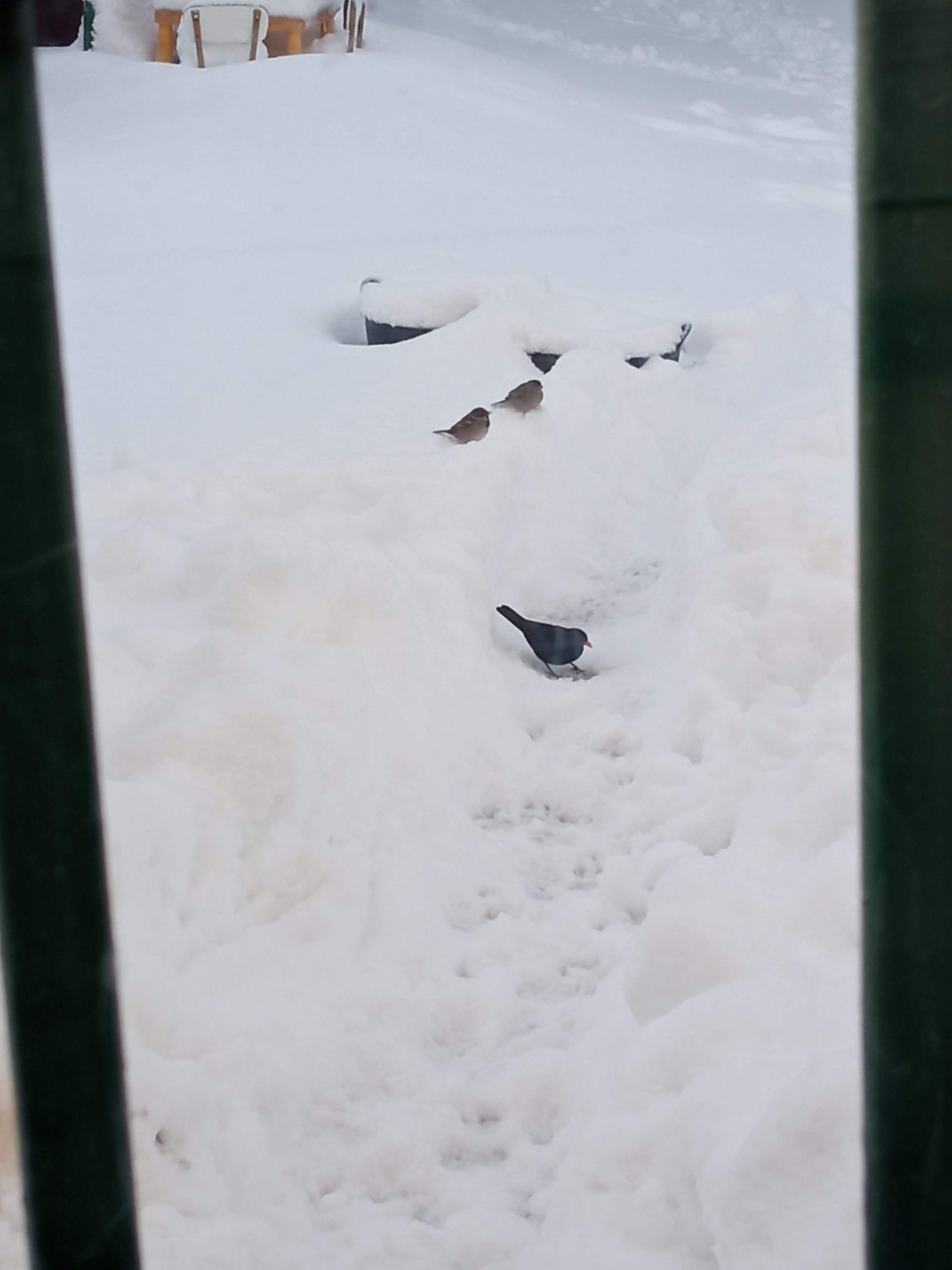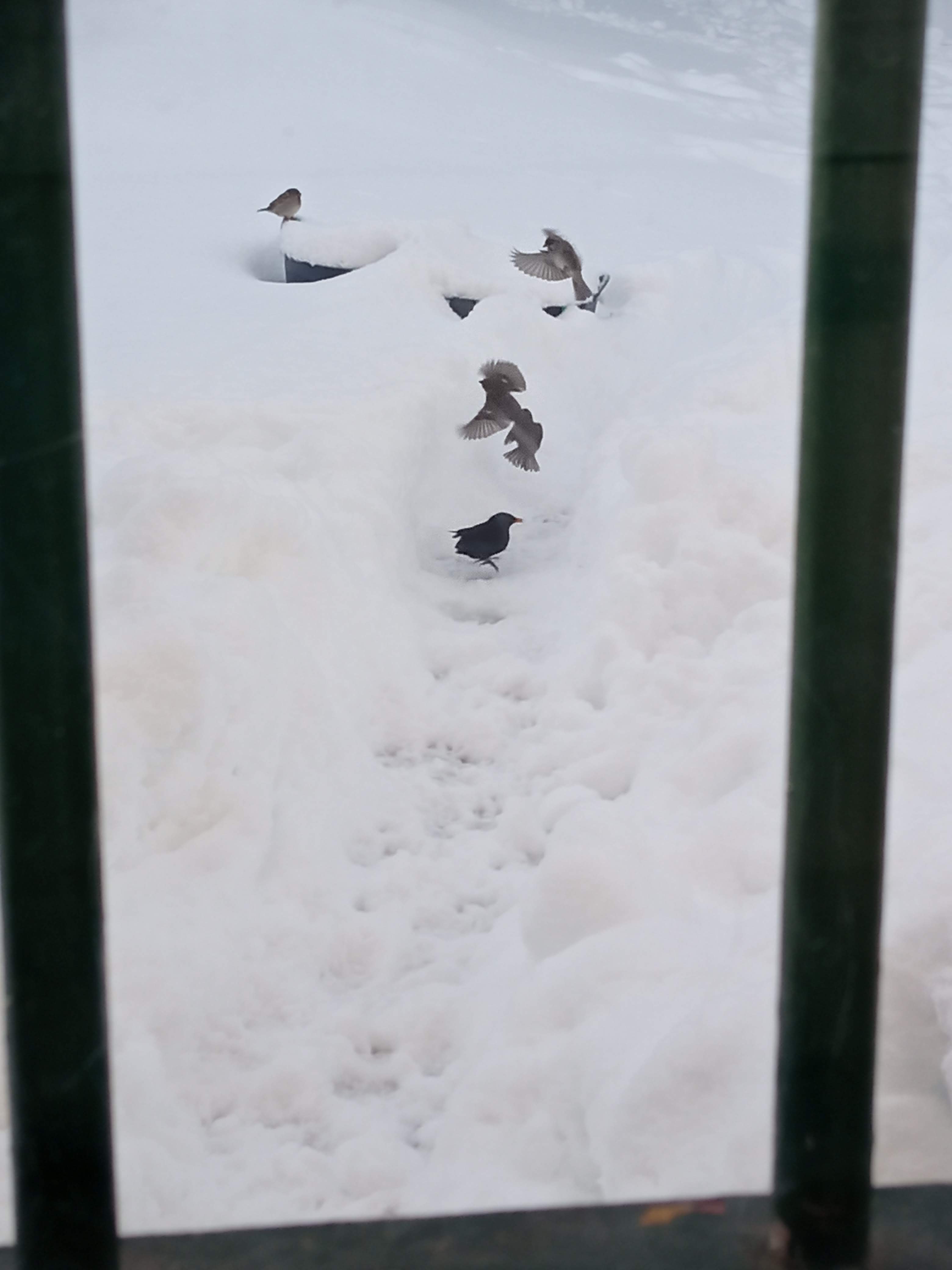 Así compartían un mirlo y una banda de gorriones comunes un platito de semillas sobre la nieve el segundo día de nevada. No están muy exigentes, cualquier platito en el suelo con semillas o miguitas de pan les vale para aumentar sus calorías en estos fríos días de invierno: