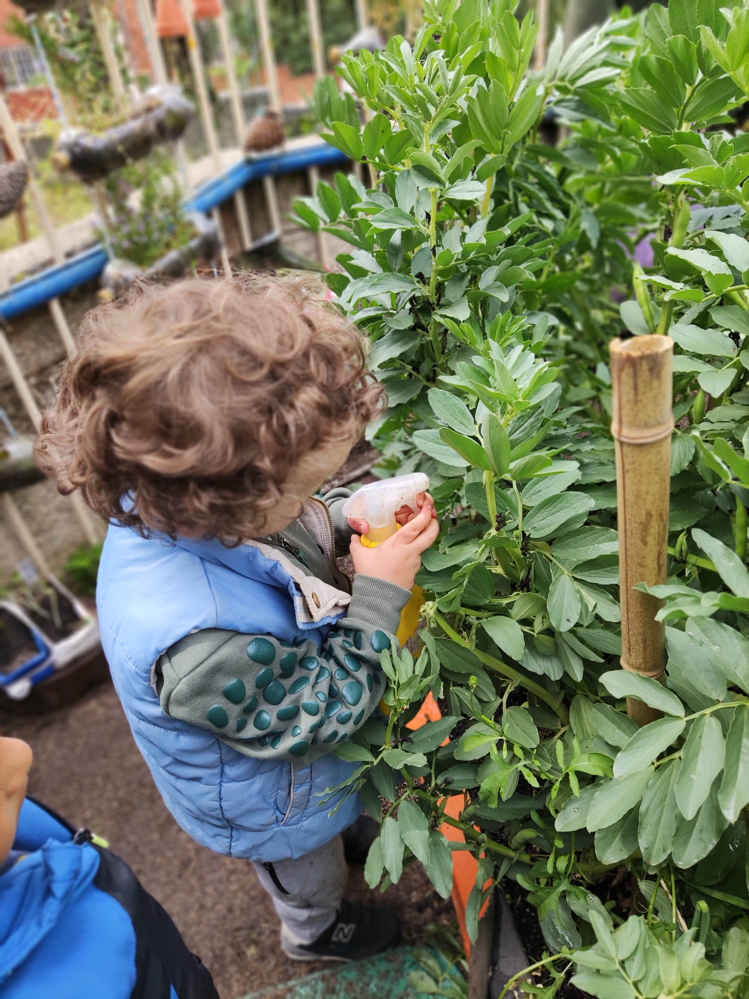 Ya llegó la primavera que la sangre altera. Los pulgones a sus habas y las flores por doquier. Abejorros y todo una miríada de polinizadores libando el néctar mientras unos intrépidos aprendices de hortelan@s fumigan con maceración de ajo y agua jabonosa.