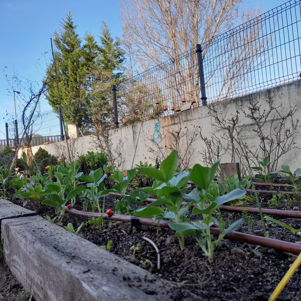 La huerta empieza a tener algo de color: las habas han brotado, los ajos sacan sus cabezas del terreno, unas cuantas lechugas han germinado.. los guisantes van trepando pequeños palitos de bambú y unas cuantas fresas empiezan a tomar terreno después de trasplantarlas por estolones con varias clases de 4 y 5 años.