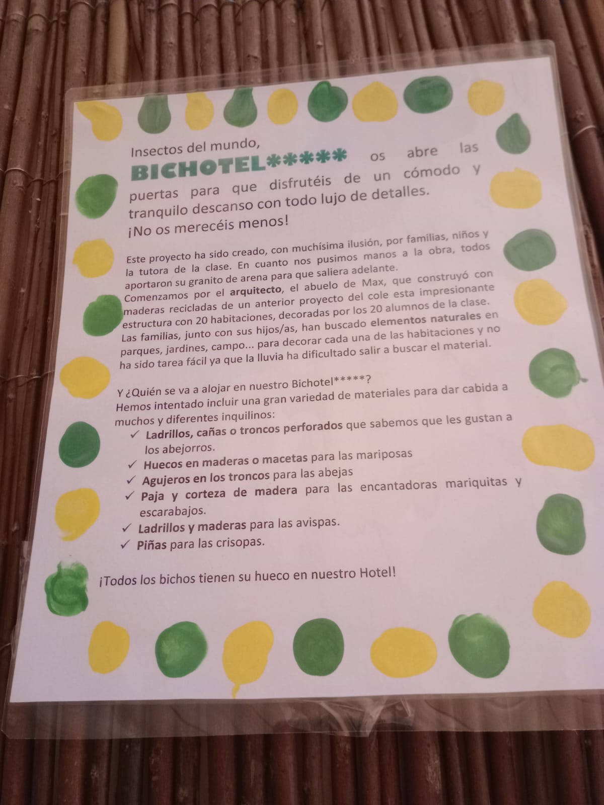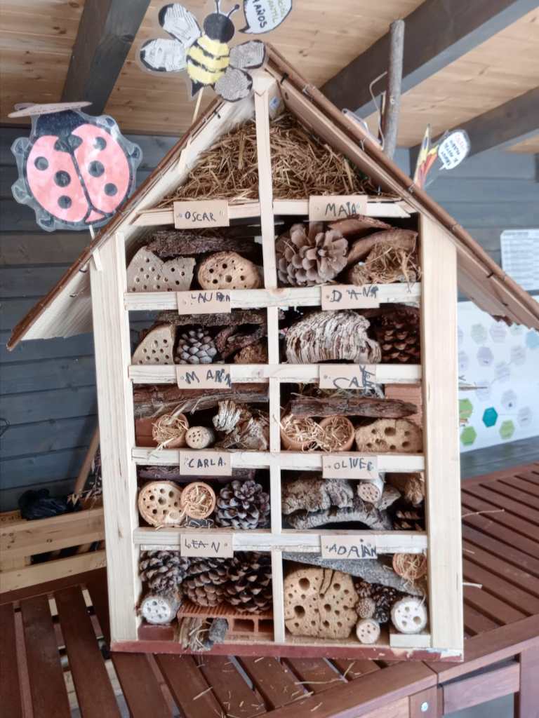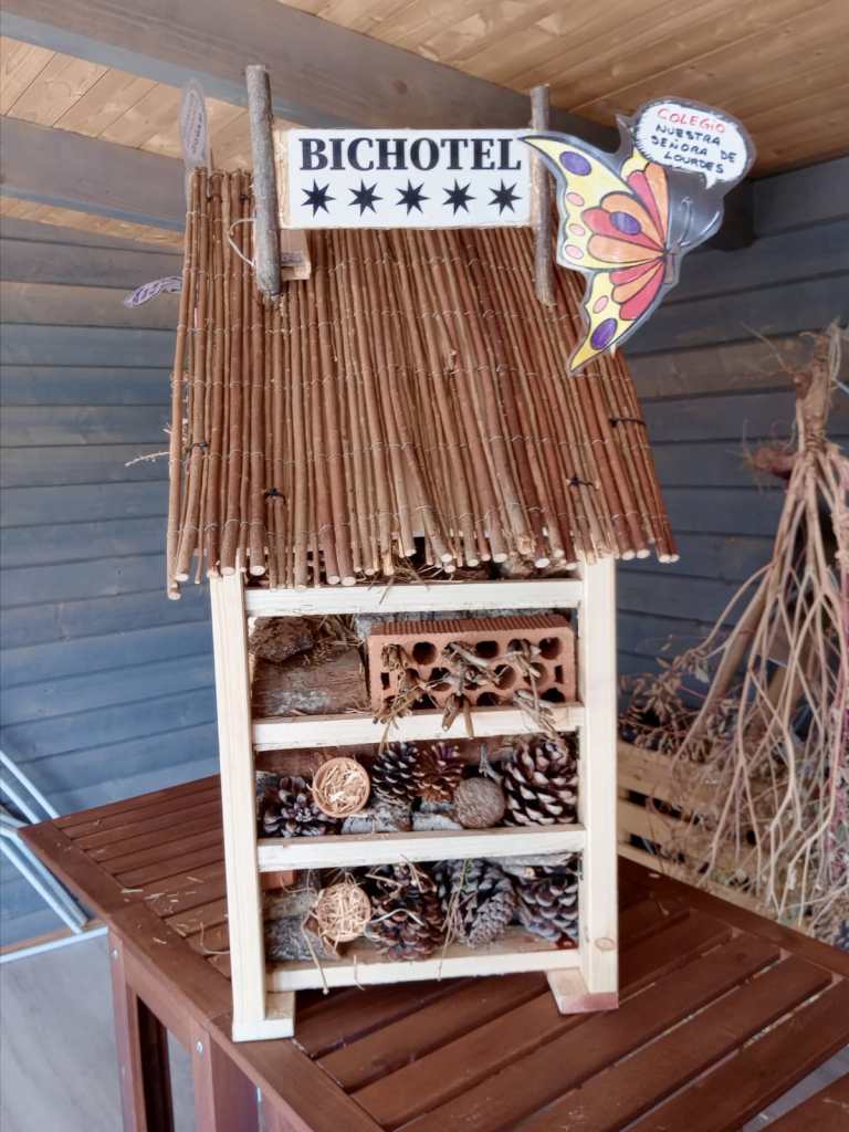 Aunque en la primera foto podéis leer la historia os la queremos contar ya que este hotel es muy especial. Las niñas y niños de la clase de 4 años del CEIP Nuestra Señora de Lourdes han estado involucradas/os en un proyecto llamado «El huerto», duranre el último trimestre han profundizado en los saberes relativos al huerto de su cole desarrollando capacidades y aptitudes en estrecha relación con la naturaleza y el aire libre. Gracias a Sonia su profe por hacer del huerto escolar un aula más para el alumnado de su clase. Se les ocurrió que para cerrar el proyecto podían presentase al concurso que nos ocupa. Pidieron ayuda a familias y con mucho cuidado han creado esta obra de arte, una estructura hecha por el abuelo de Max y Manuela y una habitación cada persona de la clase.
