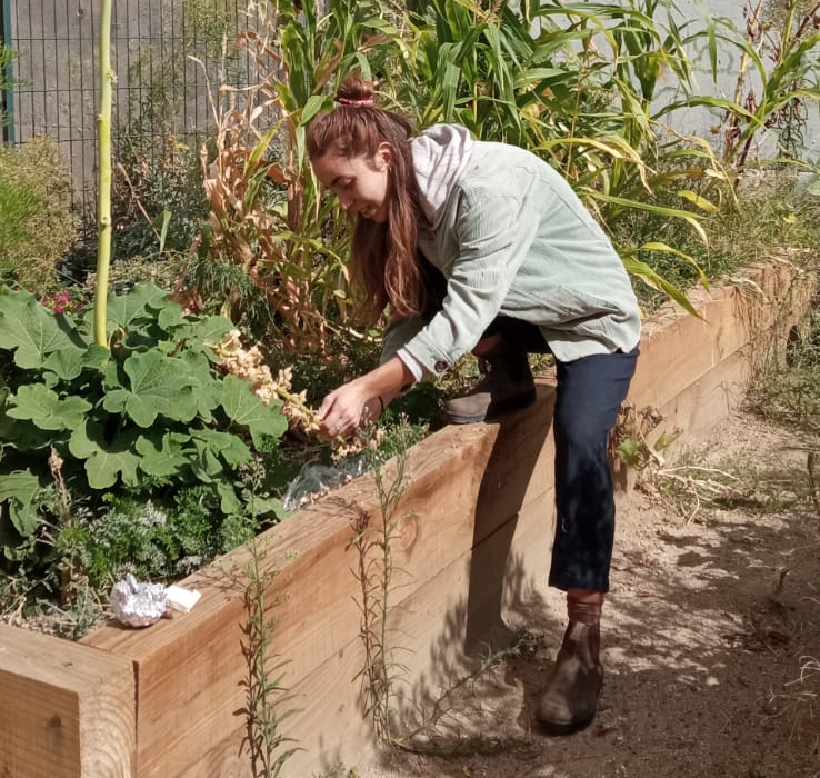 Por último, queremos aprovechar esta entrada para presentaros a Zoe, la educadora agroambiental que empieza este año con nosotr@s. Aquí la tenéis haciendo sus primeros trabajos y cosechando las primeras semillas en el Colegio El Encinar.